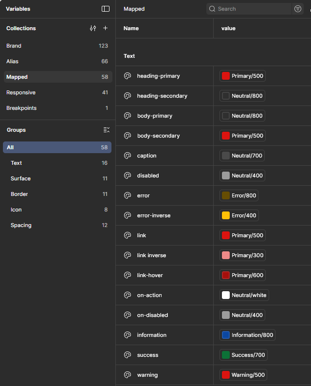 To support implementation, I established the initial variable structure in Figma, translating visual decisions into reusable tokens that could scale across components and layouts.