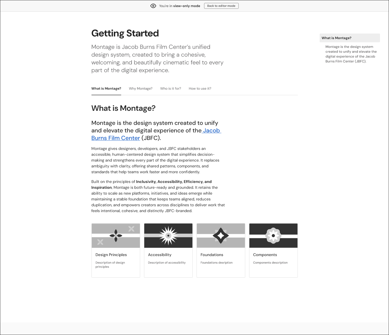 Treating documentation as part of the system reinforces Montage as a living tool rather than a static deliverable, with the ability to flex and evolve over time as the needs of the JBFC change.