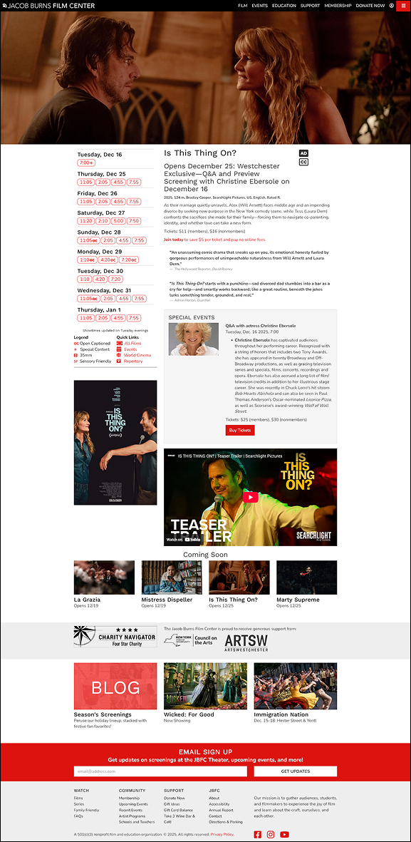 The Jacob Burns Film Center website is the digital hub for this nonprofit film center, supporting film promotion, education, memberships, and institutional storytelling. Over time, these needs have grown more quickly than the site’s structure, leading to drift in design patterns, dense layouts, and isolated design decisions.