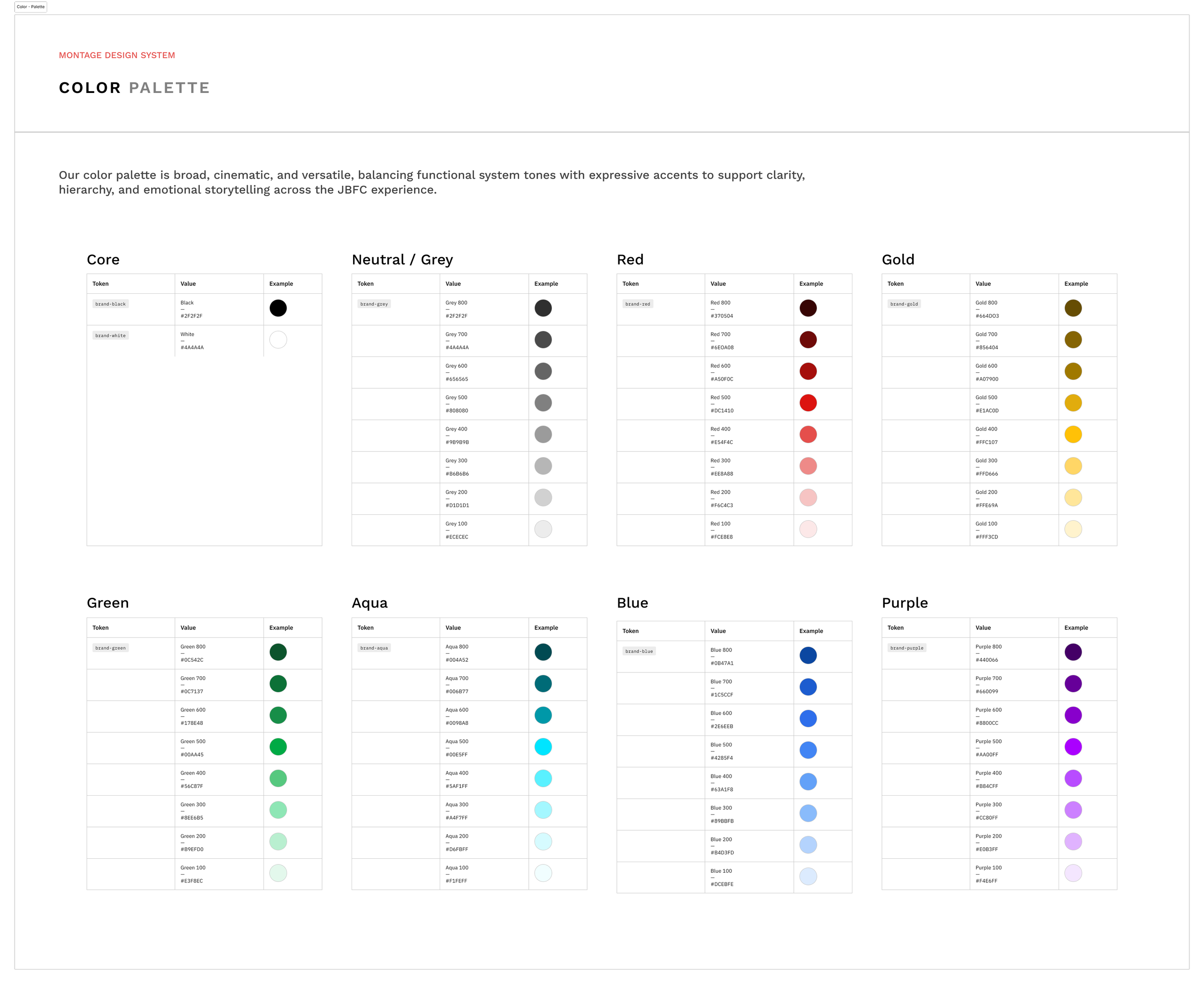 Montage was documented in Zeroheight with clear usage guidance and role-based structure. Documentation was developed collaboratively, but is informed by the same principles that shaped our system’s foundations: clarity, repeatability, and long-term maintainability. I concentrated on several sections, including the Getting Started chapter, iconography documentation, and color section. As a team, we shared the work of documenting all of the component sections.